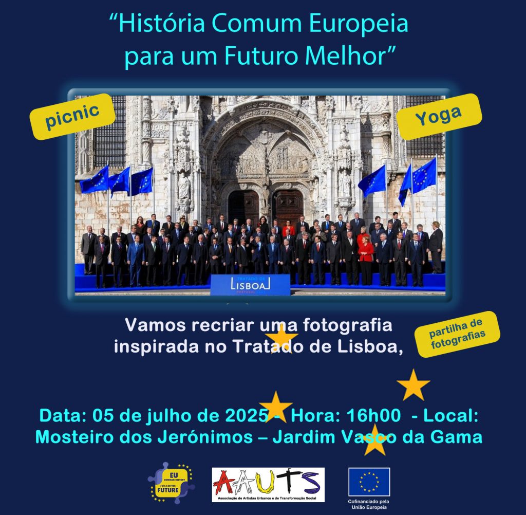 O projeto EUxFUTURE promoveu um piquenique intercultural junto ao Mosteiro dos Jerónimos, em Lisboa, onde participantes de diversas nacionalidades recriaram a foto histórica do Tratado de Lisboa e partilharam as suas próprias vivências da integração europeia.